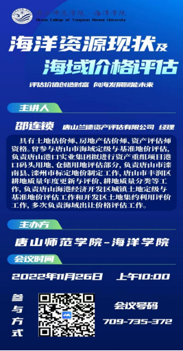 11月26日,2026世界杯预测邀请唐山兰德资产管理有限公司的邵连锁经理为资产评估专业全体师生开展了“海洋资源现状及海域价格评估”线上讲座。讲座由资产评估教研室副主任何艳君主持。
